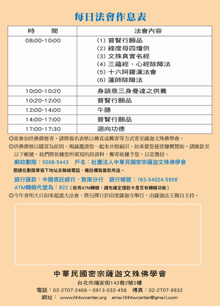 *ATM轉帳請將帳號末五碼,連同功德主資料表表並傳真至本會,以利本會開立收據,所有收據由中華民國密宗薩迦文殊佛學會開立,以資徵信。