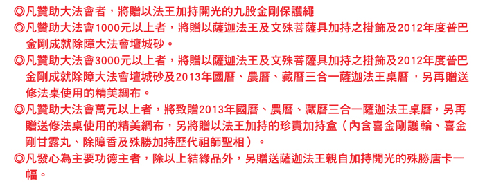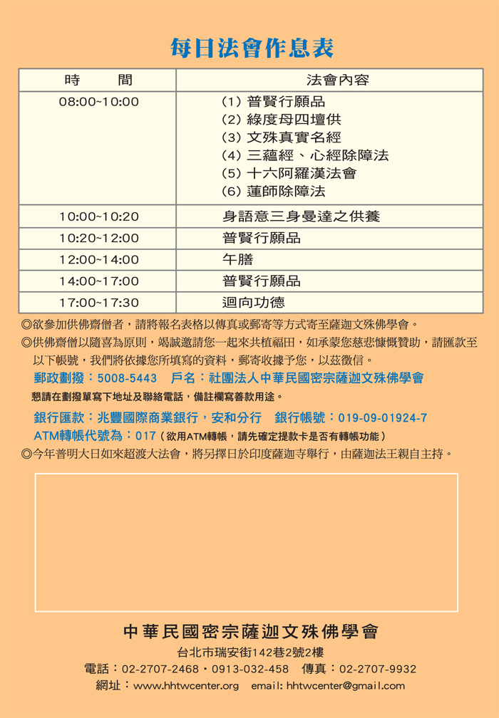 如斯具足五圓滿的普賢祈願大法會,為累積福智之資糧田,共利人我的好機會。祈願見聞者以隨喜心,輾轉相告有緣人,踴躍參與護持,供養五千僧伽共修普賢祈願大法會。